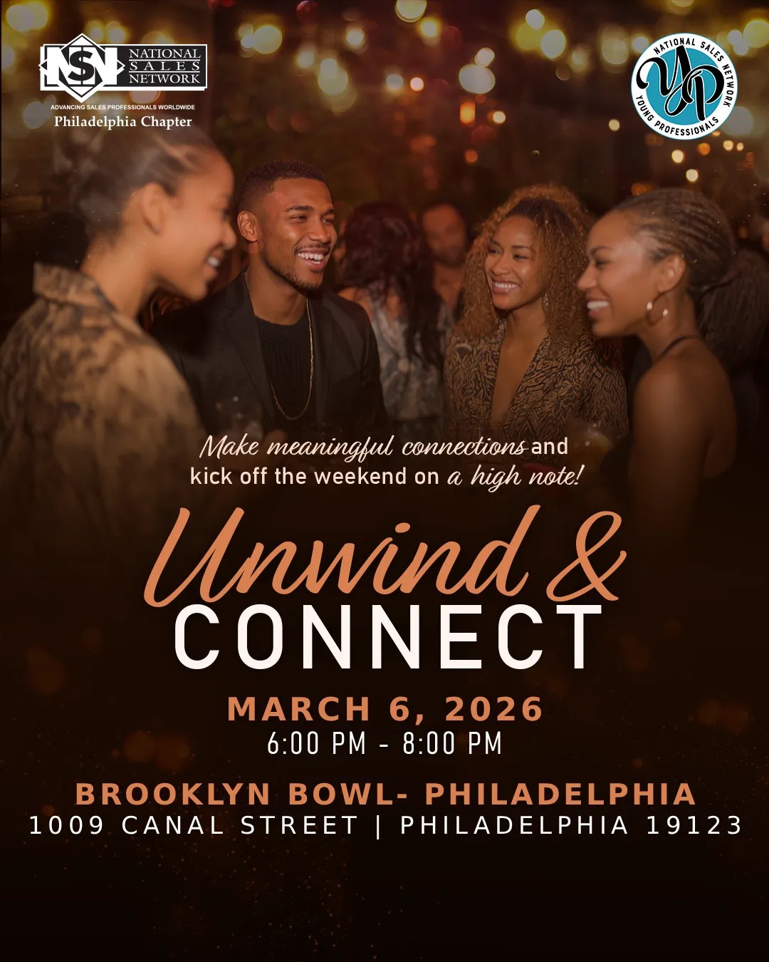 🎉Join the National Sales Network Philadelphia Chapter for an elevated networking experience designed to help you relax, recharge, and build powerful connections. Unwind & Connect is more than just a happy hour; it’s a curated evening where professionals come together in a vibrant atmosphere to kick off the weekend on a high note. 📍 Brooklyn Bowl – Philadelphia |